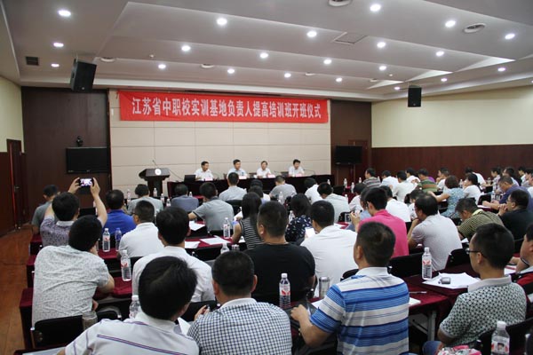 7月14日上午,2014年江苏省中职校省级实训基地负责人提高培训班开班仪式在国际交流中心二楼报告厅举行,来自全省93所职业学校的97名学员将参加为期一周的培训。我校党委书记朱爱胜、江苏省职教协会秘书长王秀文、江苏省中职教师培训中心老师曹鸿骅出席了开班仪式。