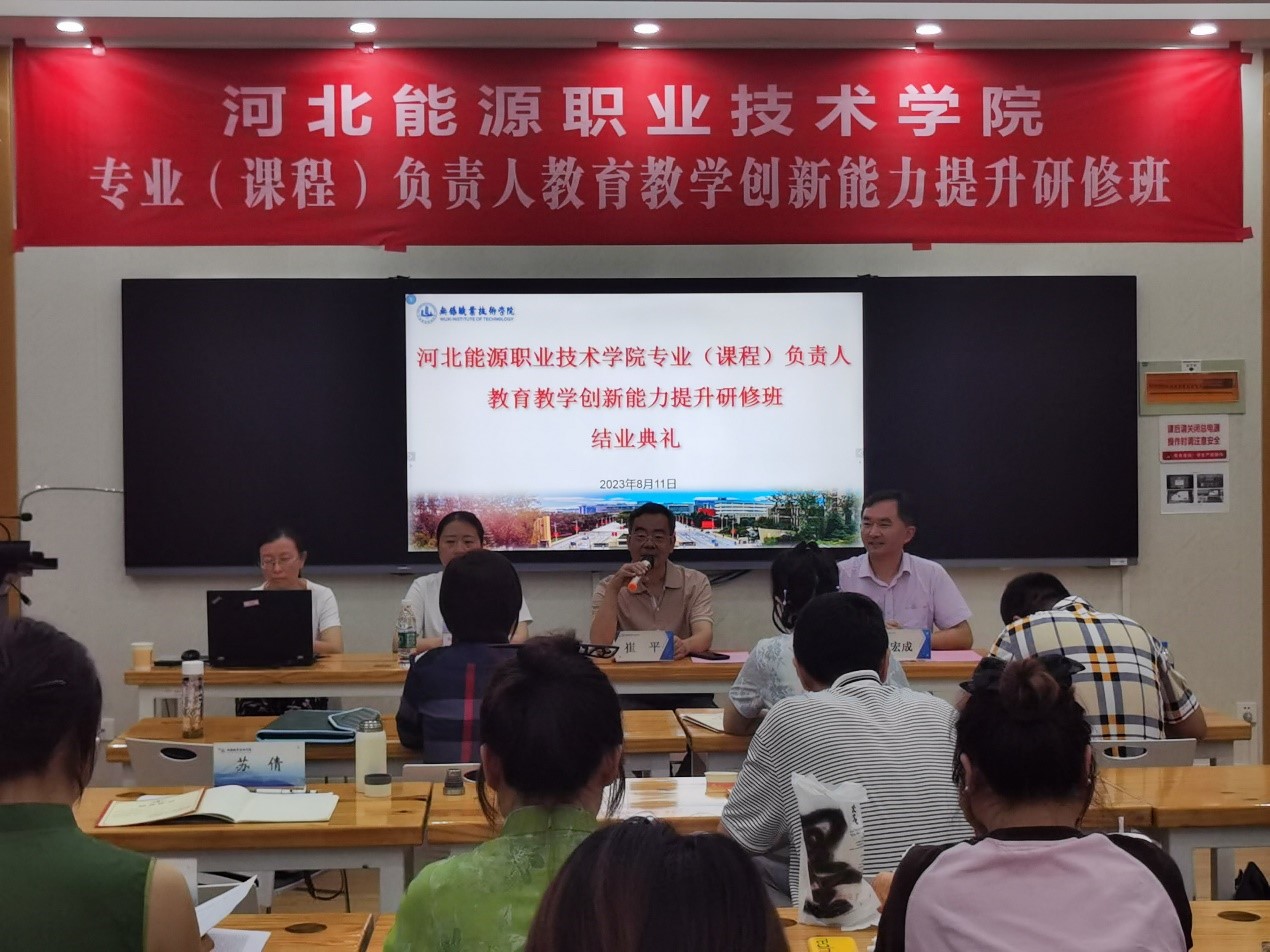 8月11日下午,由我校财经学院承办的2023年河北能源职业技术学院专业(课程)负责人教育教学创新能力提升研修班在明德楼402会议室举行了结业典礼仪式。我校继续教育学院院长崔平教授、财经学院党总支书记李湘、财经学院副院长蒋宏成、国贸系张玲老师及培训班全体学员参加了结业典礼。