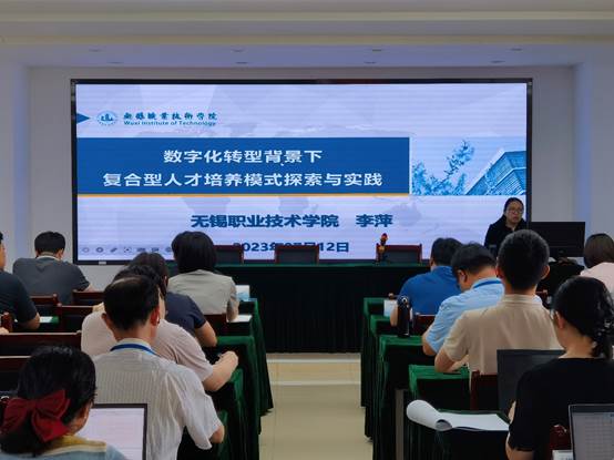 开班仪式后,李萍副院长做了“数字化转型背景下复合型人才培养模式探索与实践”报告。报告从数字化转型背景下的挑战机遇出发,介绍无锡职业技术学院通过三通三合专业集群人才培养体系、快响应、多通道专业人才培养模式、专业群对接证书群柔性课程体系的构建,实践岗课赛证融合、产学研用结合综合育人改革,开展复合型技术技能人才培养的实践路径以及丰硕成果。