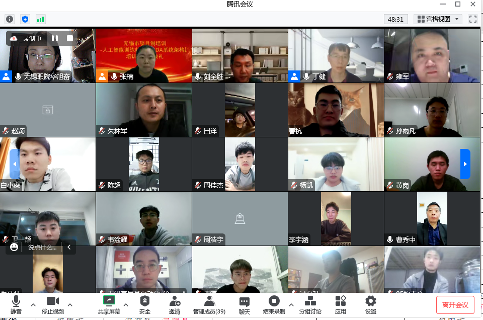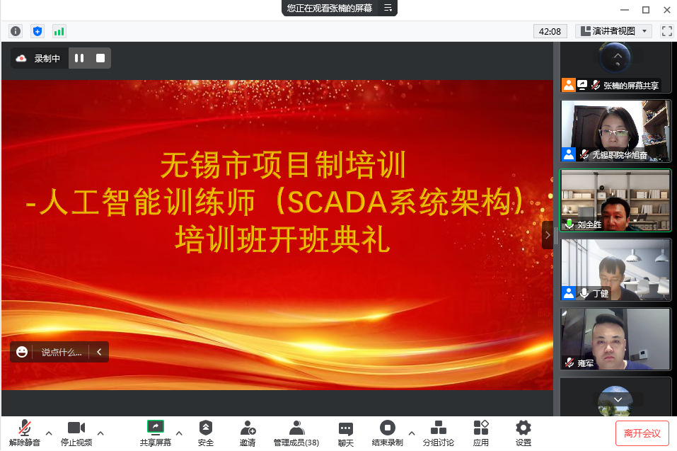 2022年11月21日由我校控制技术学院承办的无锡市项目制培训-人工智能训练师(SCADA系统架构)培训班开班仪式在线上举行。考虑到职工学员的时间需求,经多方协商讨论,本次培训班以线上线下相结合的授课方式进行,线上培训采用腾讯会议方式开展,周末学员来校培训。继续教育学院曹秀中副院长、控制技术学院刘全胜院长、丁健副院长、办公室主任华旭奋、授课教师张楠及来自无锡各企业的42名学员参加了线上开班仪式。开班仪式由控制技术学院丁健副院长主持。