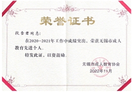 2023年2月22日,无锡市成人教育协会年会(无锡城区分会)在无锡市太湖成人教育中心校隆重召开。我校继续教育学院荣获2020-2021年无锡市成人教育“先进集体”,段雪君老师荣获2020-2021年无锡市成人教育“先进个人”的称号。