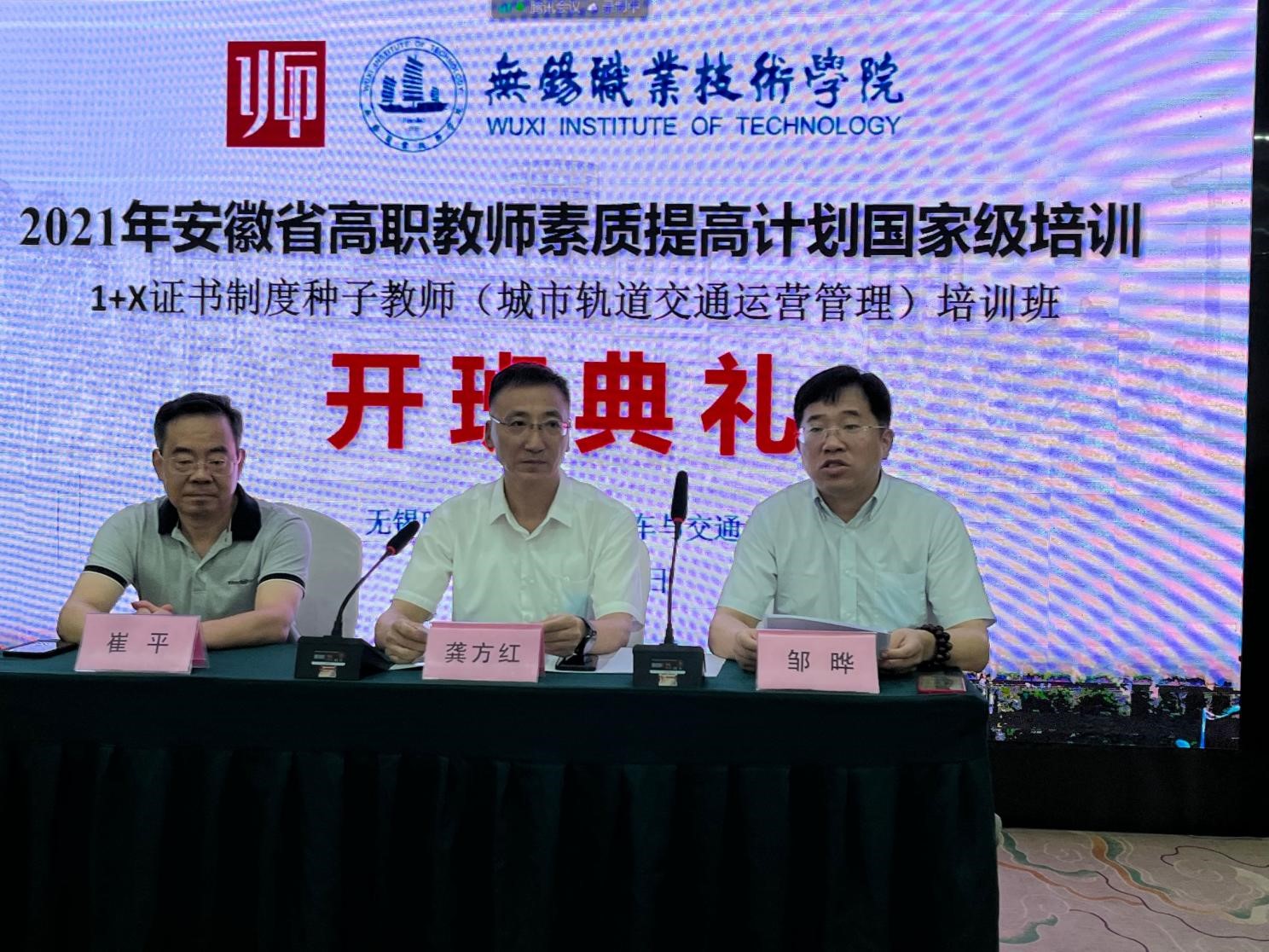 7月25日,2021年安徽省高职教师素质提高计划国家级培训---1+X 证书制度种子教师(城市轨道交通运营管理)项目在无锡市鸿庆楼大酒店三楼会议室开班。无锡职业技术学院校长龚方红教授、继续教育学院院长崔平教授、汽车与交通学院党总支书记邹晔教授以及培训班全体学员27人出席了开班仪式。